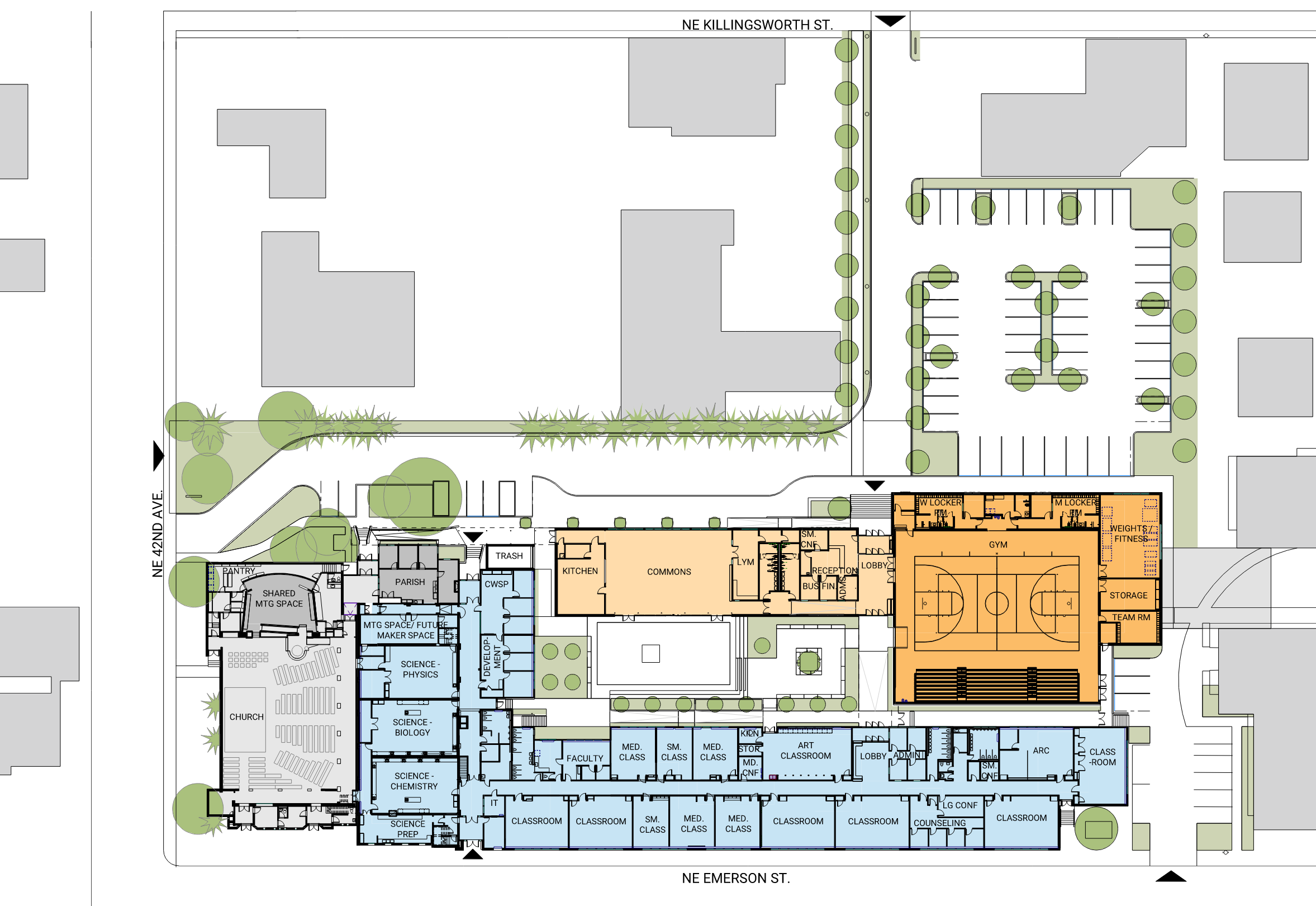 De la Salle North Catholic High School found a permanent home by renovating and adding a new building to an underutilized parish school in Portland’s growing Cully neighborhood. A classroom and administration wing, closed since the 1980s, will be renovated to provide flexible