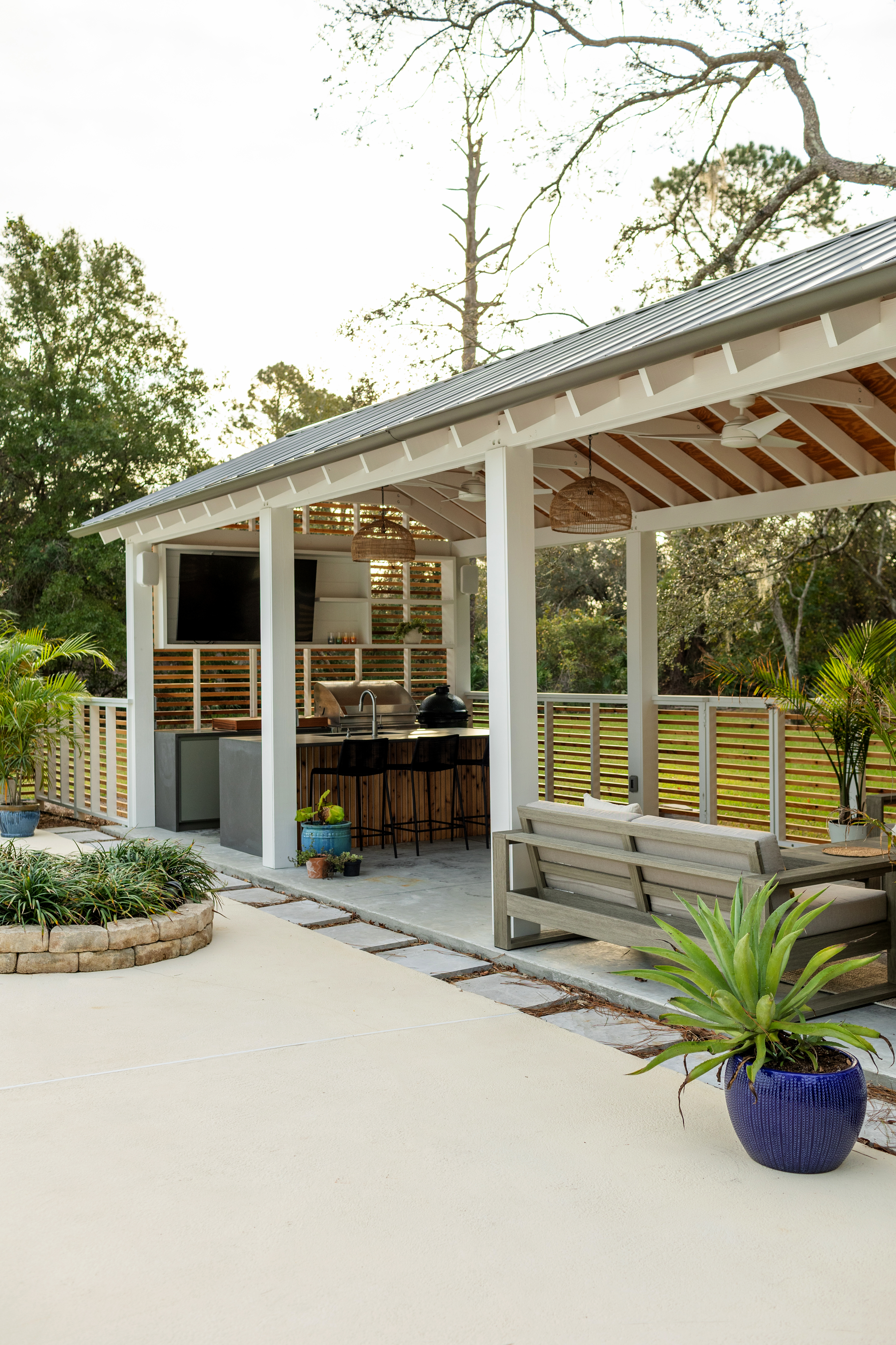 St Augustine, FloridaActing as a gateway from a backyard pool deck to a seculded forest, the Pavilion provides outdoor living, dining and kitchen space. The simplicity of the structure and form reflect the clients desire to integrate the pavilion with the existing single story ranch home, as well as remain flexibility for hosting family events.